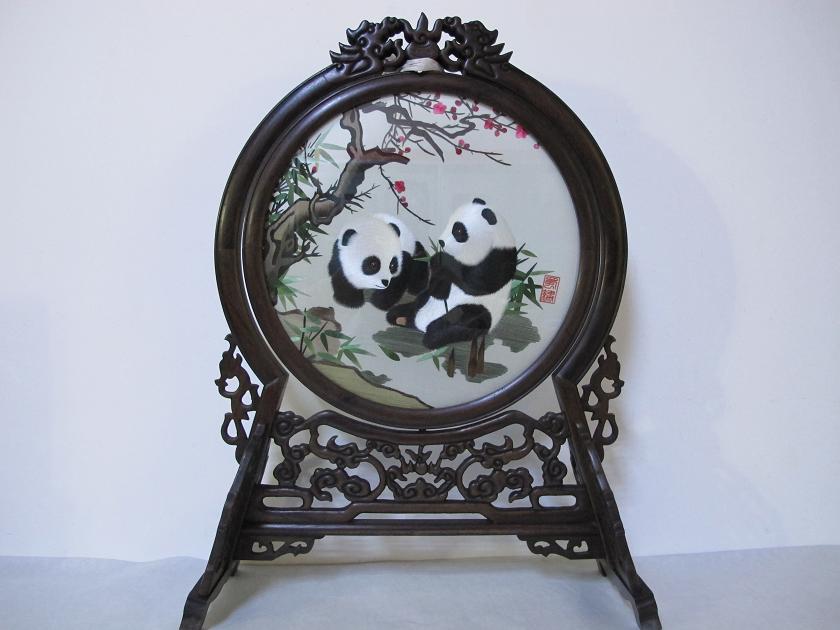 蜀绣又称“川绣”,是以四川成都为中心的刺绣品的总称。产于四川成都,绵阳等地。蜀绣距今已有二千多年的历史,被誉为“东方艺术明珠”。蜀绣以软缎、彩丝为主要原料,其绣刺技法甚为独特,至少有100种以上精巧的针法绣技,如五彩缤纷的衣锦纹满绣、绣画合一的线条绣、精巧细腻的双面绣和晕针、纱针、点针、覆盖针等都是十分独特而精湛的技法。当今绣品中,既有巨幅条屏,也有袖珍小件;既有高精欣赏名品,也有普通日用消费品。比如北京人民大会堂四川厅的巨幅“芙蓉鲤鱼”座屏和蜀绣名品“蜀宫乐女演乐图”挂屏、双面异色的“水草鲤鱼”座屏、“大小熊猫”座屏,就是蜀绣中的代表作.