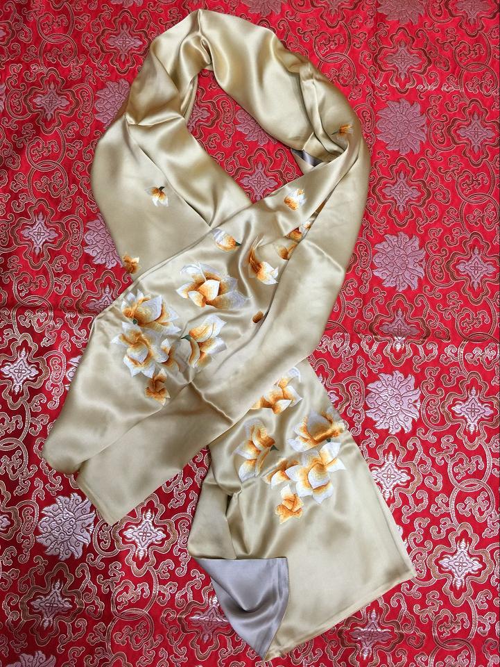 手绣品围巾,披肩,被套,睡衣,绣画合一的线条绣、精巧细腻的双面绣和晕针、纱针、点针、覆盖针等都是十分独特而精湛的技法。