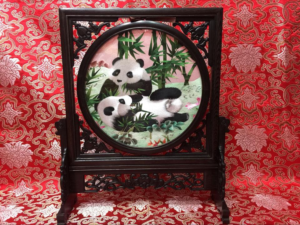 蜀绣又称“川绣”,是以四川成都为中心的刺绣品的总称。产于四川成都,绵阳等地。蜀绣距今已有二千多年的历史,被誉为“东方艺术明珠”。蜀绣以软缎、彩丝为主要原料,其绣刺技法甚为独特,至少有100种以上精巧的针法绣技,如五彩缤纷的衣锦纹满绣、绣画合一的线条绣、精巧细腻的双面绣和晕针、纱针、点针、覆盖针等都是十分独特而精湛的技法。当今绣品中,既有巨幅条屏,也有袖珍小件;既有高精欣赏名品,也有普通日用消费品。比如北京人民大会堂四川厅的巨幅“芙蓉鲤鱼”座屏和蜀绣名品“蜀宫乐女演乐图”挂屏、双面异色的“水草鲤鱼”座屏、“大小熊猫”座屏,就是蜀绣中的代表作.